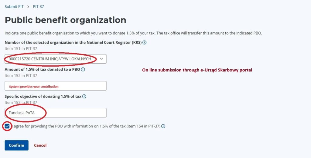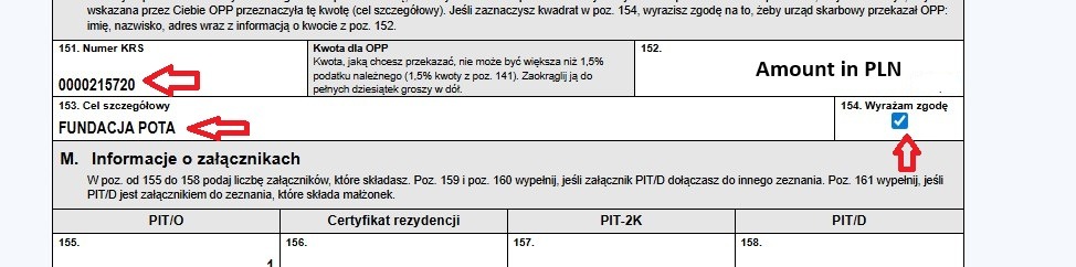 You can support PoTA by entering the KRS number 0000215720 (Centrum Inicjatyw Lokalnych) in field 151 of your tax declaration form. Make sure to include “Fundacja PoTA” in the “Cel szczegółowy” (specific objective of donating 1.5% of tax) field 153, and check the box in field 154 (I agree for providing the PBO with information on 1.5% of the tax) to confirm your donation.
